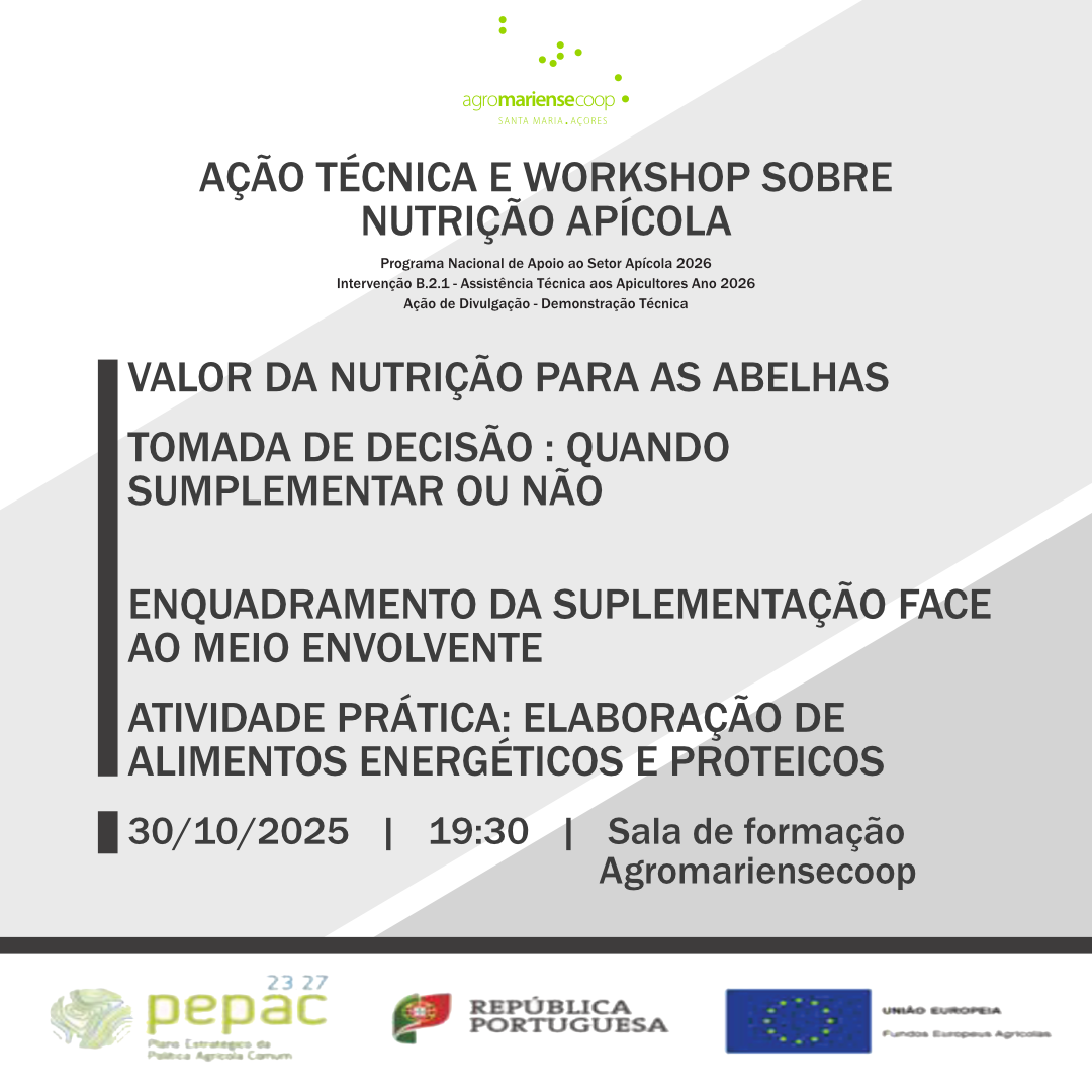 A AgromarienseCoop promove, no próximo dia 30 de outubro de 2025, pelas 19h30, na sua sala de formação, uma ação técnica e workshop dedicado ao tema da “Nutrição Apícola”.